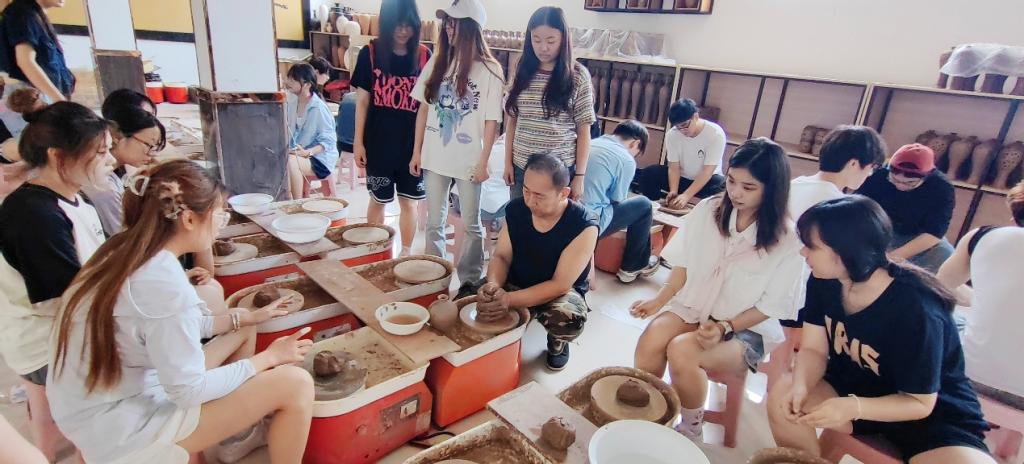 随后,同学们走进制作工坊,近距离观摩龙山黑陶从原料处理、拉坯成型,再到雕刻装饰、烧制打磨的完整制作流程。每一个环节,都凝聚着匠人们的心血与智慧。有非遗传承人现场展示精湛技艺,并手把手指导同学们实践操作。在拉坯环节,同学们小心翼翼地将陶泥置于转盘,在传承人的帮助下,随着转盘转动,慢慢塑造出陶器雏形;压光环节,大家全神贯注,用工具细致打磨陶器表面,力求呈现黑陶特有的光泽;雕刻装饰环节,同学们认真聆听师傅们讲授刻刀镂空装饰的力度和技巧。尽管过程中繁缛复杂,但经过反复尝试,同学们逐渐掌握技巧,最终成功制作出属于自己的黑陶作品。