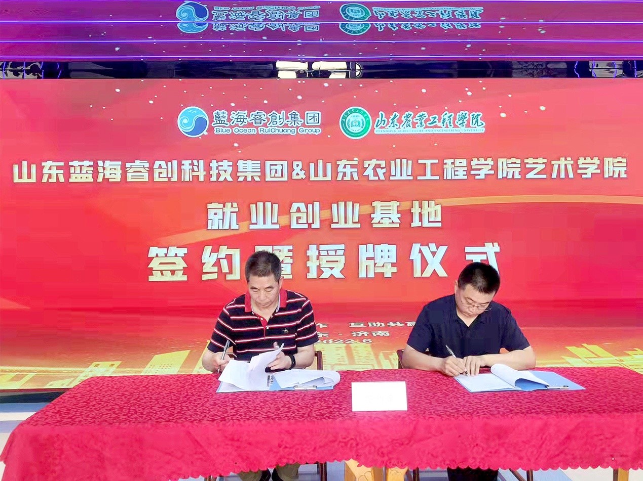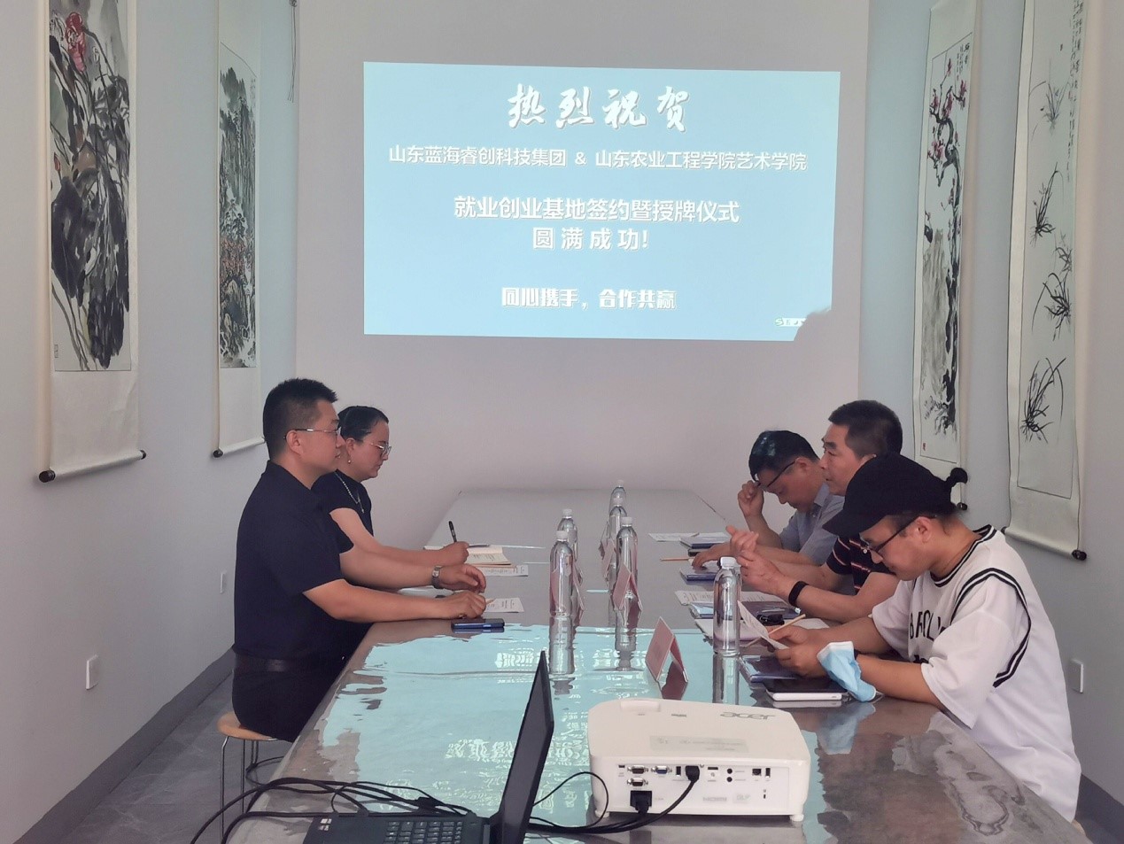 6月22日,艺术学院与山东蓝海睿创科技集团签订大学生就业创业合作协议,挂牌仪式在山东蓝海睿创科技集团总部成功举行。艺术学院党总支书记解心江、副院长安明明、团总支书记马兴、辅导员史晨旭老师、蓝海睿创集团董事长吕昌建、办公室主任胡凤等人共同参加该活动。