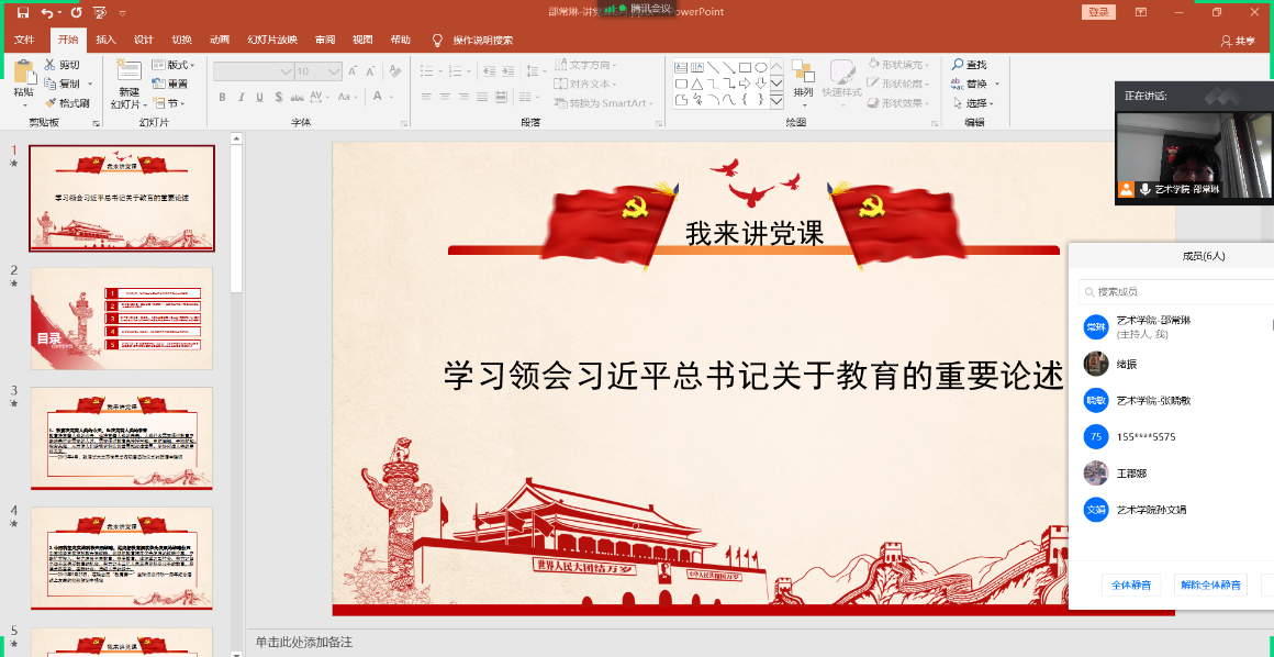 6月29日,艺术学院教工第二党支部以腾讯会议形式开展了线上上党课活动。党课主题为“学习领会习近平总书记关于教育重要论述”,通过本次党课学习,每位党员教师对教育工作有了更深的认识,更加明确了自己的工作职责和方向。