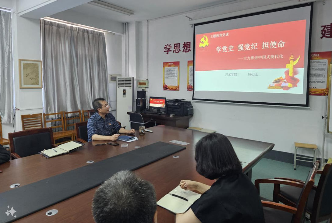 在深入学习贯彻习近平新时代中国特色社会主义思想的背景下,为进一步加强党的纪律建设,推动党纪学习教育走深走实。艺术学院党总支于2024年5月16日在学院党建活动室成功举办了一场深刻而生动的主题教育党课。本次党课由艺术学院党总支书记解心江主讲,面向教职工党员,主题为“学党史,强党纪,担使命,---大力推进中国式现代化”。