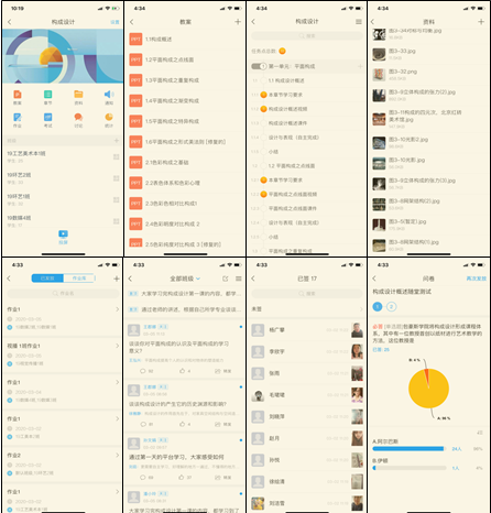 根据《构成设计》课程的教学目标,在确定前期的教学流程和熟悉教学教学平台后,老师们进行了在线课程的建设工作,分别进行了选用教材,提炼教学内容、制作课件、录制视频、明确考核方案和考核标准、完善作业库和资料库等,进行了完整的课程在线建设