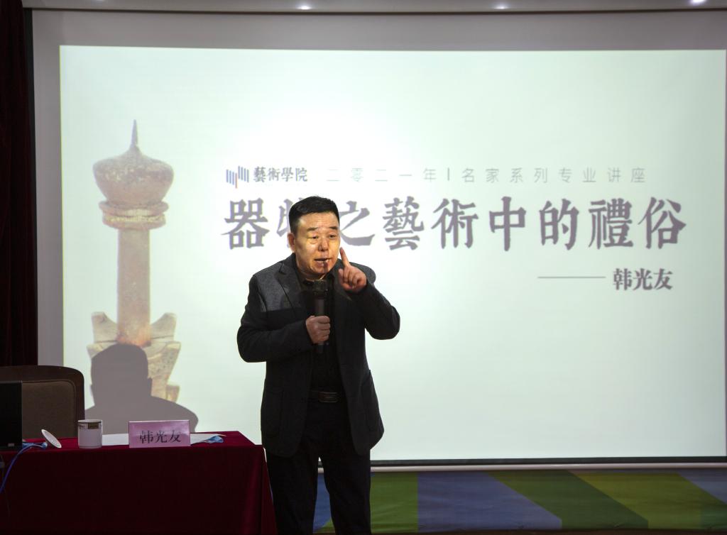 11月17日下午,山东乡忆民俗博物馆馆长、中国文物学会民族民俗专业委员会副主任委员、中国传媒大学名誉教授韩光友先生应邀来艺术学院做学术报告。在济南校区1号楼五楼学术报告厅为师生们带来“器物之艺术中的礼俗”的专题学术讲座。本次讲座由艺术学院副院长安明明主持。
