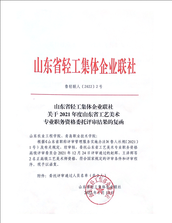 近日,山东省轻工集体企业联社发文,根据《山东省职称评审管理服务实施办法》及有关规定,经评审,我院赵辉老师获评“正高级工艺美术师”资格。全省高校系统,仅2人获评。