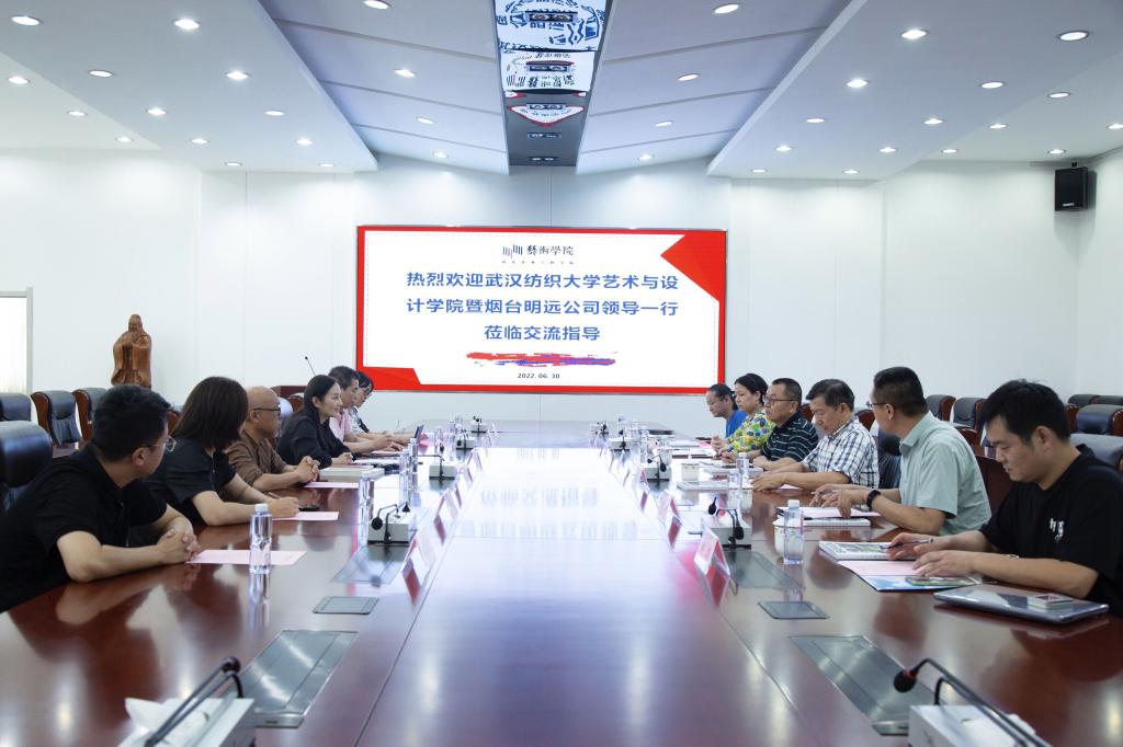 2022年6月30日下午,武汉纺织大学艺术与设计学院党委书记刘文元、烟台明远创意生活科技股份有限公司董事长陈义忠一行来我院考察交流。艺术学院院长韩璐、党总支书记解心江等人参加交流座谈。