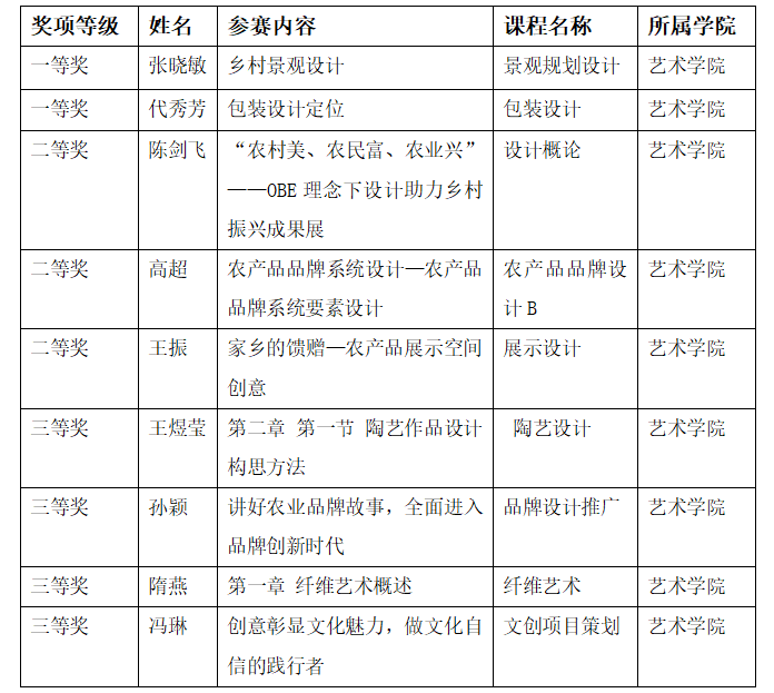 在学校举办的首届“知农爱农”课程思政教学比赛中,艺术学院捷报频传,喜报连连。在经历学院、学校的层层选拔,我院14名教师参加了此次比赛,获得一等奖2名,二等奖3名,三等奖4名的好成绩,艺术学院也获得学校颁发的优秀组织奖,获奖名单如下: