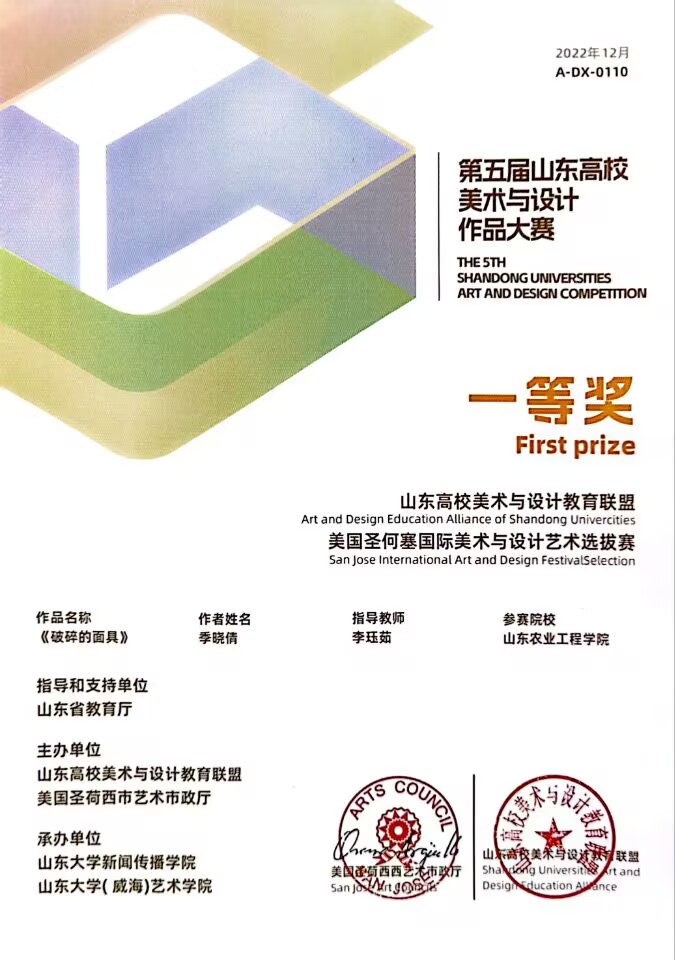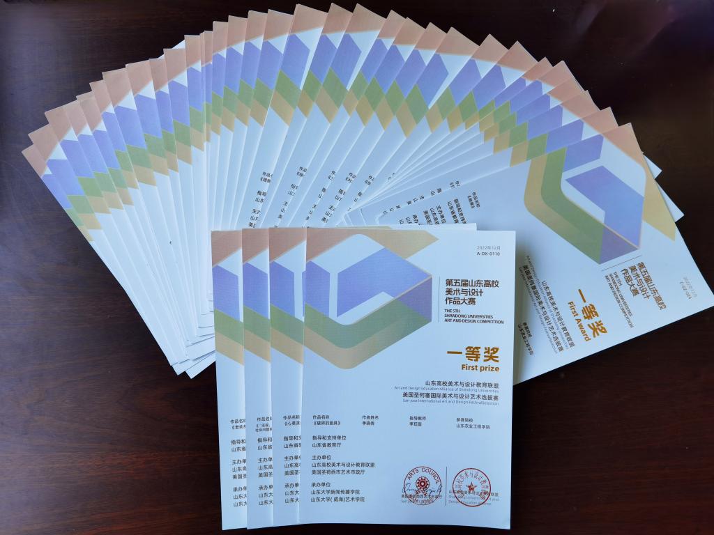 艺术学院学子在第五届山东高校美术与设计作品大赛中共荣获奖项52项,一等奖5项,二等奖15项,三等奖16项,优秀奖16项,其中安明明、魏向昕、李珏茹、孙文娟获优秀指导教师。