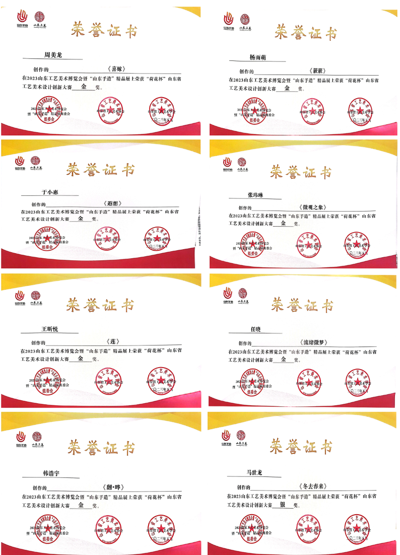 我院工艺美术专业学生作品在“荷花杯”山东省工艺美术设计创新大赛中喜获佳绩,共荣获奖项15项,金奖7项,银奖6项,铜奖2项。