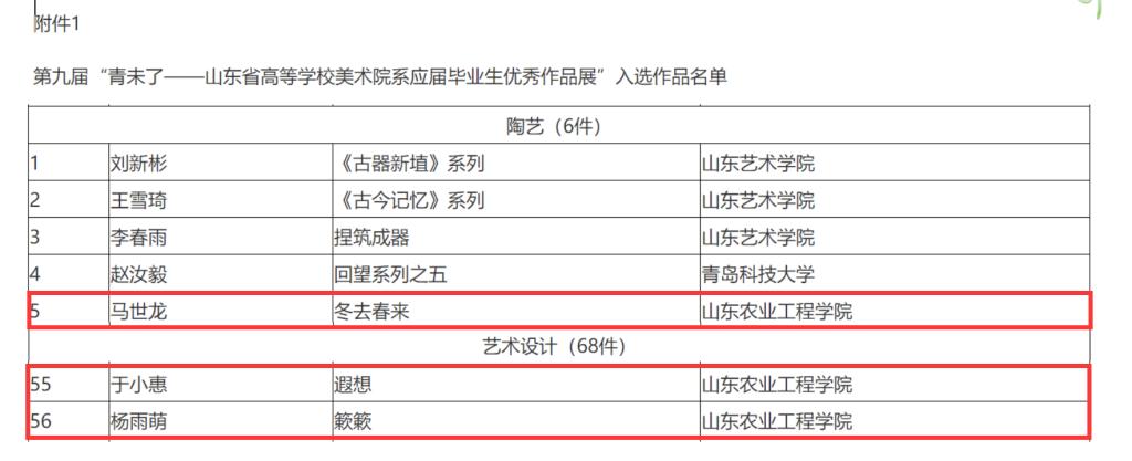 本届“青未了”共收到43所高校报送的有效作品457件。经严格评审,最终评出入选作品197件,其中,艺术学院三幅作品入选,分别是19级工艺美术专业毕业生马世龙同学的陶瓷艺术作品《冬去春来》(崔强老师指导),于小惠同学的纤维艺术作品《遐想》(王煜莹老师指导)、杨雨萌同学的纤维艺术作品《簌簌》(隋燕老师指导)。7月8日“青未了”山东省高等学校美术院系优秀毕业生作品展在山东美术馆隆重开展。
