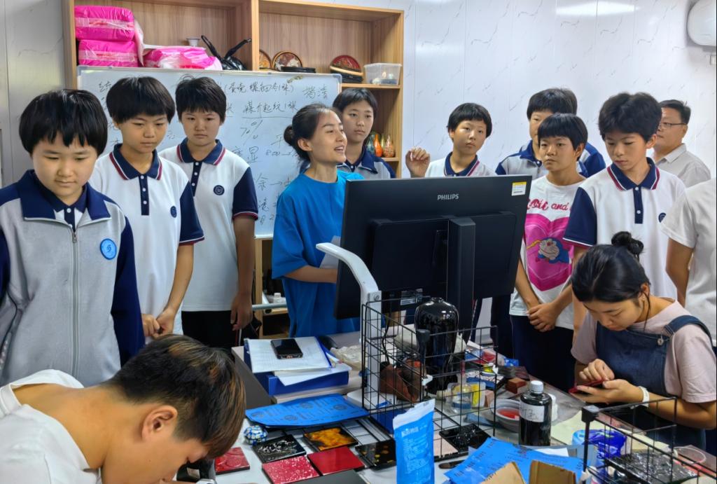 9月21日上午,历城双语实验学校的学生们在老师和部分家长的带领下,排着整齐的队伍来到校园,走进艺术学院工艺美术实验室和小展厅。学院实验室的专业老师为同学们讲解了传统印染、陶艺、漆艺、掐丝珐琅等传统工艺是怎样利用传统工艺制作出精美的手造工艺品的,同时还给同学们科普了一些现代技术在工艺品开发中的应用,包括实验室的一些高科技设备,如高温窑炉、布料印刷机、电脑辅助设计、拉胚机等的功能和作用。