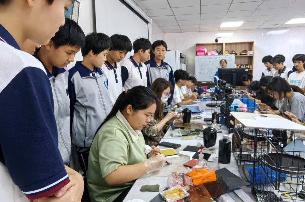 同学们眼界大开,第一次看到这么多精美的传统陶艺、现代陶艺、扎染蜡染、掐丝珐琅画和纤维艺术品,好奇的眼睛目不暇接,东摸摸、西瞅瞅,给讲解老师提出了很多问题,老师们都耐心地一一解答。在学院专业老师的讲解下,同学们既了解了传统手造知识,又了解了计算机、纺织品印刷机、拉胚机等现代工具和科学技术的应用。
