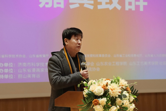 中国高等教育学会摄影教育专业委员会副会长、山东漫画家协会副主席、济南影视传媒学会主席、本届大赛组委会主任王传东教授代表组委会致辞。他对本届大赛的组织情况进行了说明,对大赛成果进行了总结,他表示,在政府主管部门和省市科协的正确指导下,在各高校同仁和行业企业的大力支持下,动漫大赛已成为大学生展现自我风采、提高实践能力的舞台, 成为高等院校和行业企业交流合作、协同发展的平台, 有力地促进了我省动漫专业建设和动漫产业健康可持续发展。