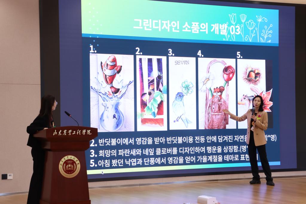 展览期间,艺术学院师生与韩国设计领域的专家学者就“国际绿色设计发展”展开学术研讨,共同交流探讨当今国际绿色设计的前沿动态与未来趋势。双方通过现场主旨分享和书面论文发表的形式,从不同的视角探讨当前绿色设计的热点话题,分享各自独到见解和研究成果。
