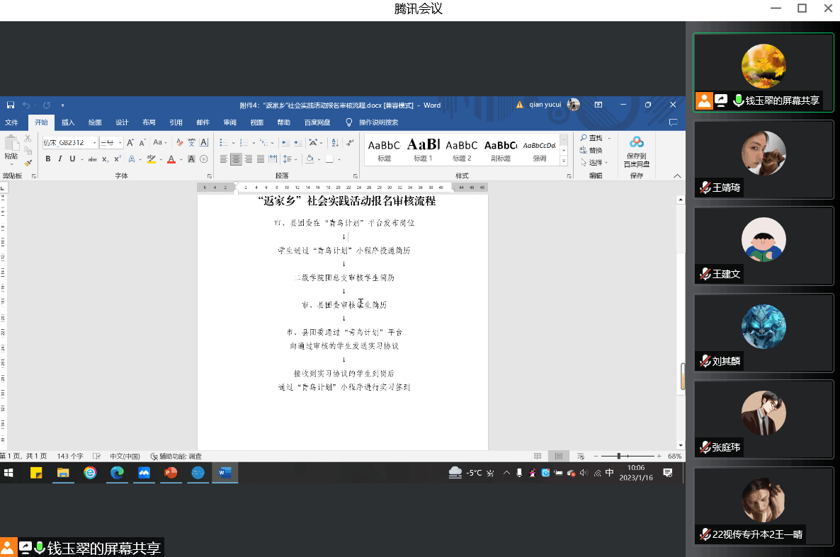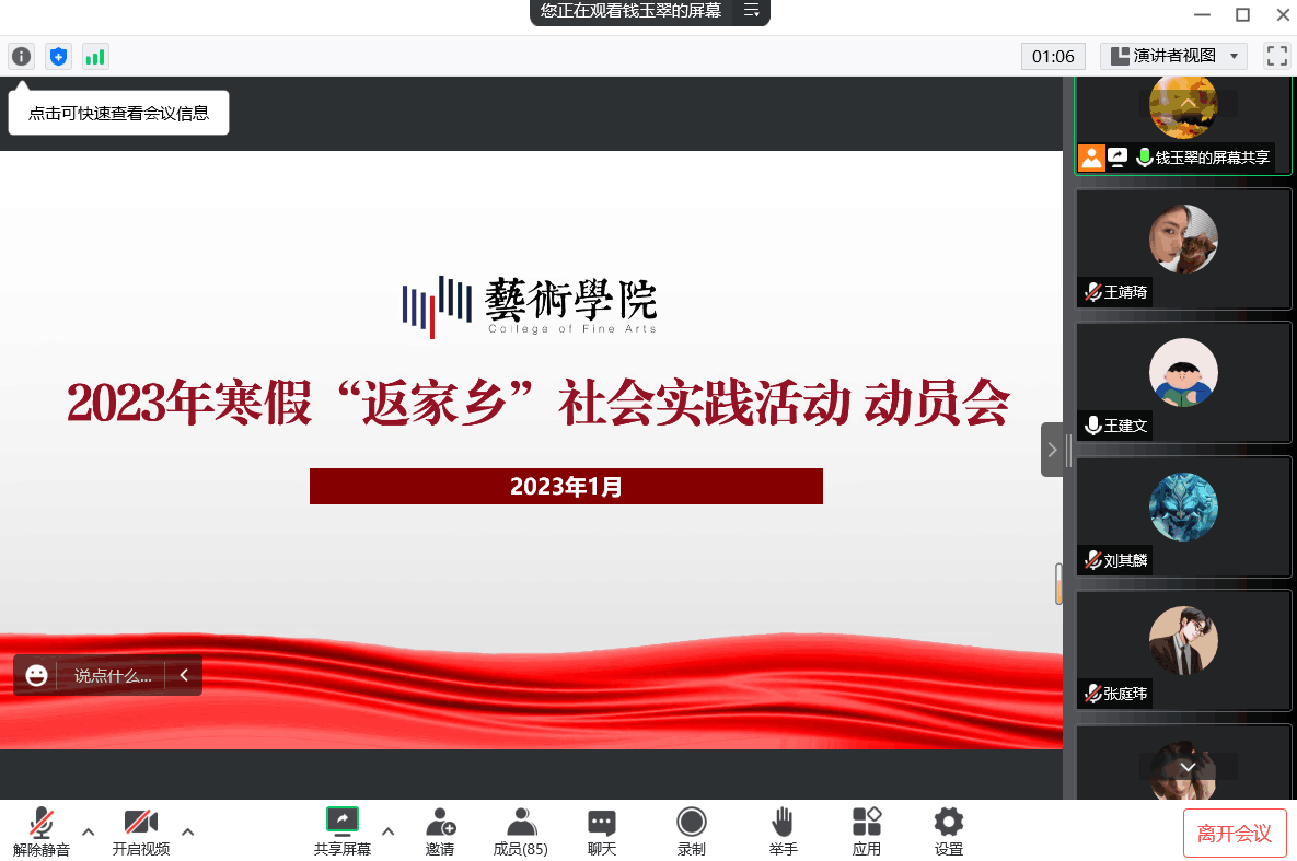 为引领广大青年学生深入学习贯彻习近平新时代中国特色社会主义思想和党的二十大精神,深入领会落实习近平总书记关于青年工作的重要思想,在实践中受教育、长才干,增强青年的担当意识。1月16日上午,艺术学院通过腾讯会议的方式召开2023年寒假“返家乡”社会实践线上动员会议,学院全体辅导员老师,以及各班级负责人参加了此次会议。