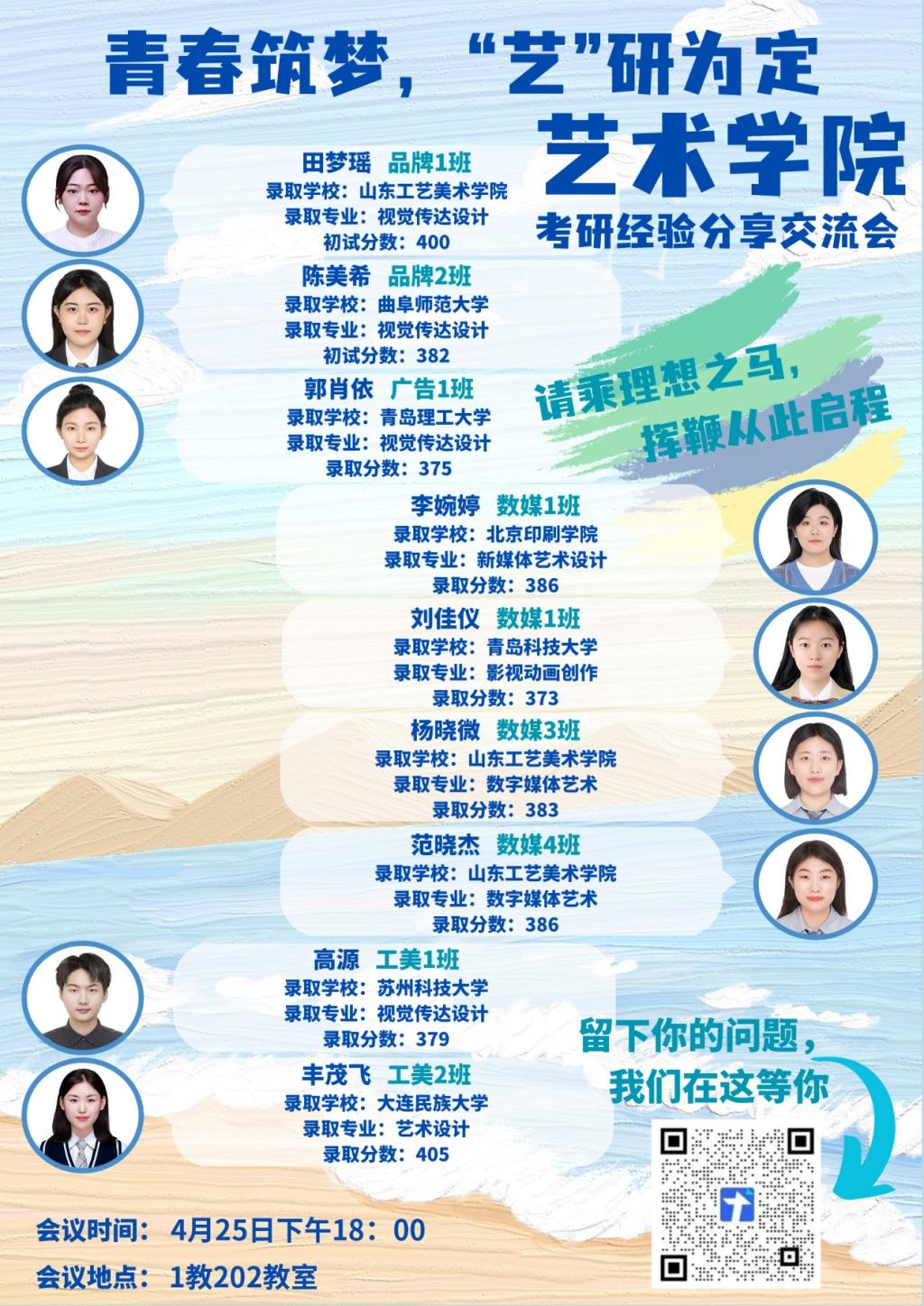 为进一步激发学生考研热情,明确考研目标,掌握科学的备考方法,及时做好学业规划,2023年4月25日,艺术学院考研经验分享会在济南校区1教202教室举行。
