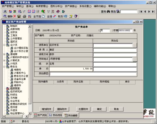 固定资产在使用过程中可能会发生某些属性的变化,变动管理对使用单位、使用人、使用方向、存放地点、现状、单价等信息项进入变动,另外可以增减附件,资产的其他信息不能通过固定资产变动 来进入修改系统会跟踪并记录下每一件资产从购置后到平时使用状态的变化,到最后报废(或丢失或调出)的整个生命周期。