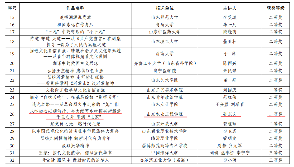 近日,中共山东省委教育工委公布了全省高校“精品党课”获奖名单,必赢食品科学与工程学院教工第二党支部书记孙东文同志主讲的党课《永怀初心砥砺前行,奋力续写乡村振兴新篇章——千里之外 爱满“土家”》获得全省二等奖。